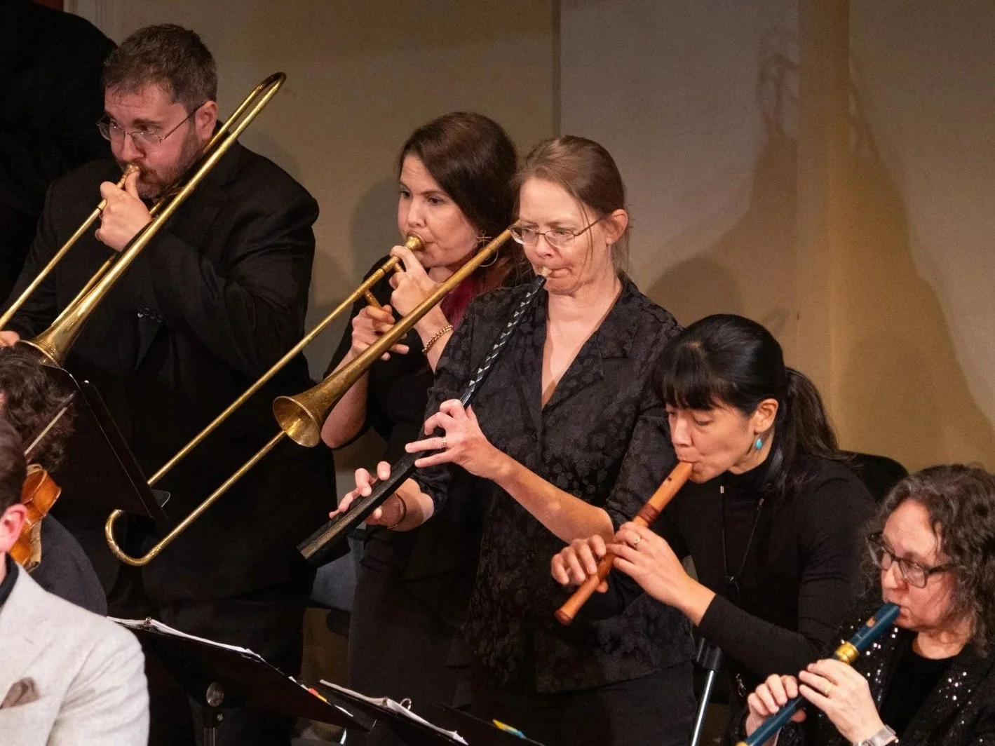 Euridice, featuring Liza Malamut, Ben David Aronson, Garrett Lahr playing the sackbut, Haymarket Opera Company and The Newberry Consort, 2025. Photo: Elliot Mandel